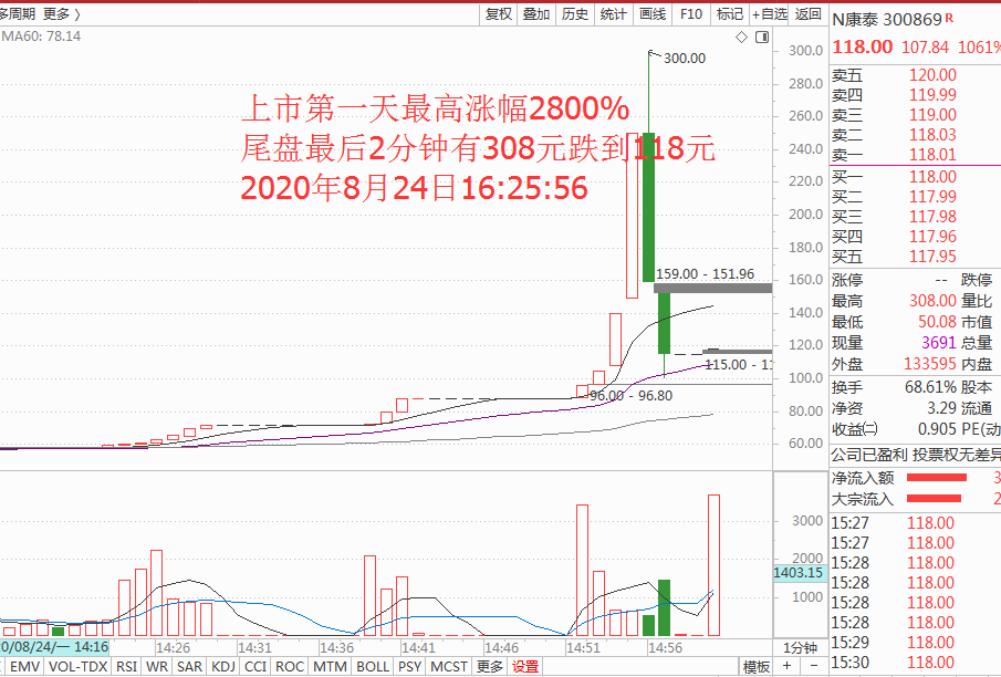 就拿今天尾盘康泰医学从最高价308元两分钟跌到118元收盘,就问这样的跌幅有谁能受得了,谁又是谁的韭菜?最高的时候涨幅2800%,什么概念?谁能抓到?我不行,还是老实点,保住本金再说。截图保存,以作警示,如图: