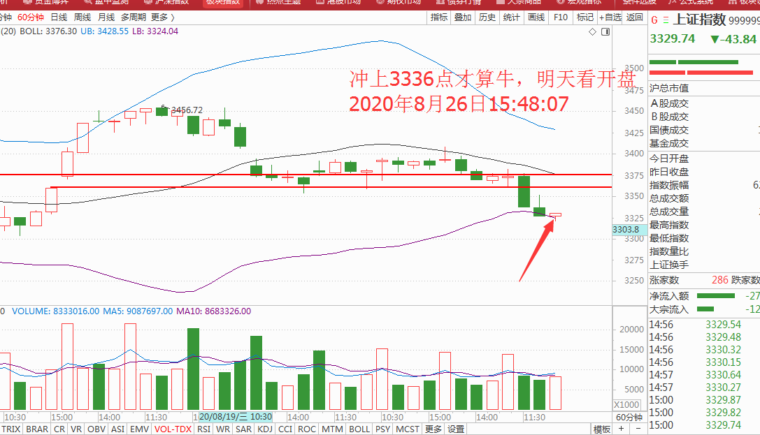 技术上踩着BOLL轨道的下轨,明天早盘能否走出小级别的弃子线和放量上攻是关键,只有明天走出单日翻转的信号重新站上3336点上方才能确定这个回调结束。