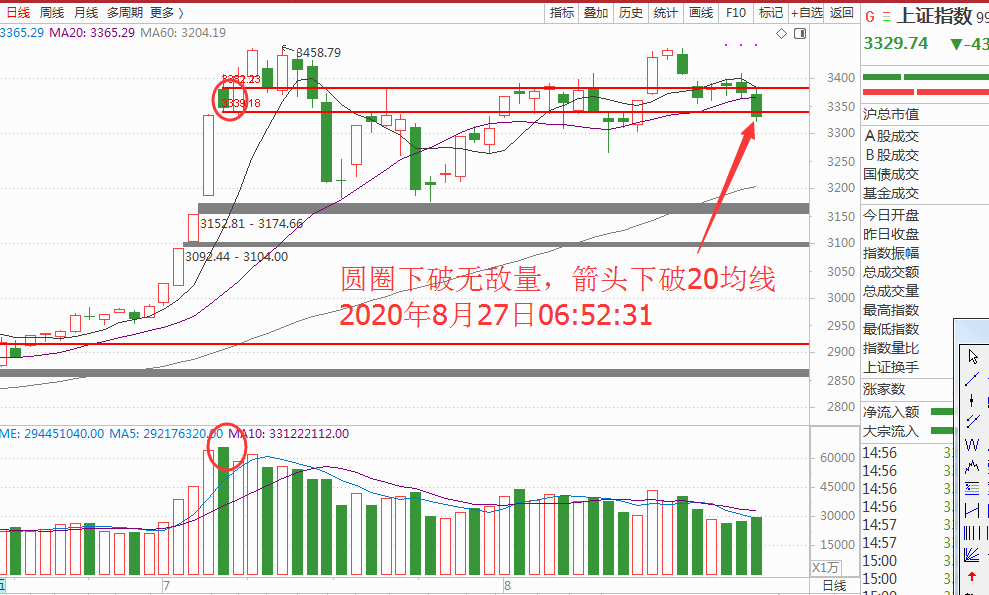 一旦30、15分钟形成一个趋势线方向是空头,那么我们就要找无敌量的压力位,无敌量压力位没有上来的情况下不去看转折和多头,今天开盘的阴线巨量541亿点位是3333点,那么这个点位就是压力位,只要解放这个点位我们才开始看转折。