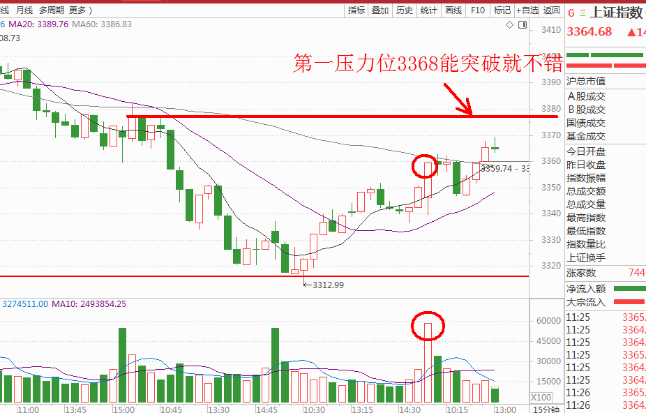 今天的早盘果然按照预期走出放量上攻的结构,但是很明显,资金不支持。依旧是中小板比较活跃,主板在盘中曾经收绿险破早盘低点,但是成交量依旧是缩量,15分钟放量阳线也仅仅有548亿,这个成交额是多头进攻型的,细心的话不难看成早盘5分钟的成交额是抛售盘,这是昨天进场的有获利的抛盘,这就是涨幅20%的弊端,谁拿的票当天涨20%不离场啊,不离场的脑子是灌水不少了。