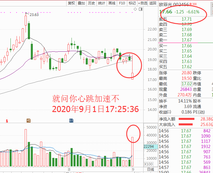 盘中初期上涨行业板块只有十几个,上攻途中最多也仅仅只有24个板块上行收红,居前的行业板块有旅游、汽车、通用,元器件有所异动,没有赚钱效应,最悲催的是乐歌周末和调研的团队闹掰,今天触及跌停,而欧菲光因为苹果的消息安排一字跌停。神奇的是下午开盘公告说这消息只是传闻,不是真的,然后就有开板,此前跌停板封单130万手近22亿元。最终当天成交额66亿,换手率15%左右。