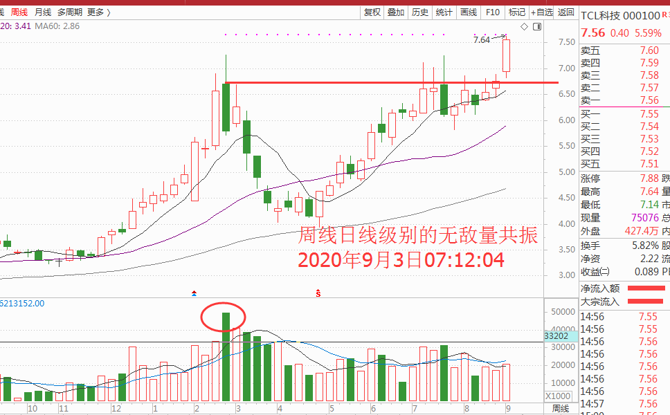 我顺藤摸瓜看了一下,TCL科技00100,我去,好久没有关注现在变大美女了,而且8月31日出现了漂亮的无敌量洗盘行为,大家可以重点关注这种符合技术形态的老庄股,同时启用技术上的跟踪止盈策略,如图: