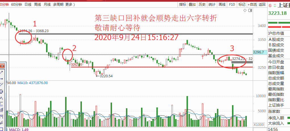 这个位置我的观点市场涨涨跌跌很正常,关键是看清大势,做好对应,目前看虽然加速下跌有一次探前低,但是他在我眼中依旧是夹板而已,转折也是一处即发。夹板下沿第一个下缺口在9月8日已经回补了,这基本就是确定下方有托举盘,而今天30分钟的缺口将成为新的分水岭,明天周五收官,如果早盘出现翻转K,并且放量拿下今天的下缺口的话势必走出转折的信号,所以,我们就以今天的下缺口作为进场的依据,如图: