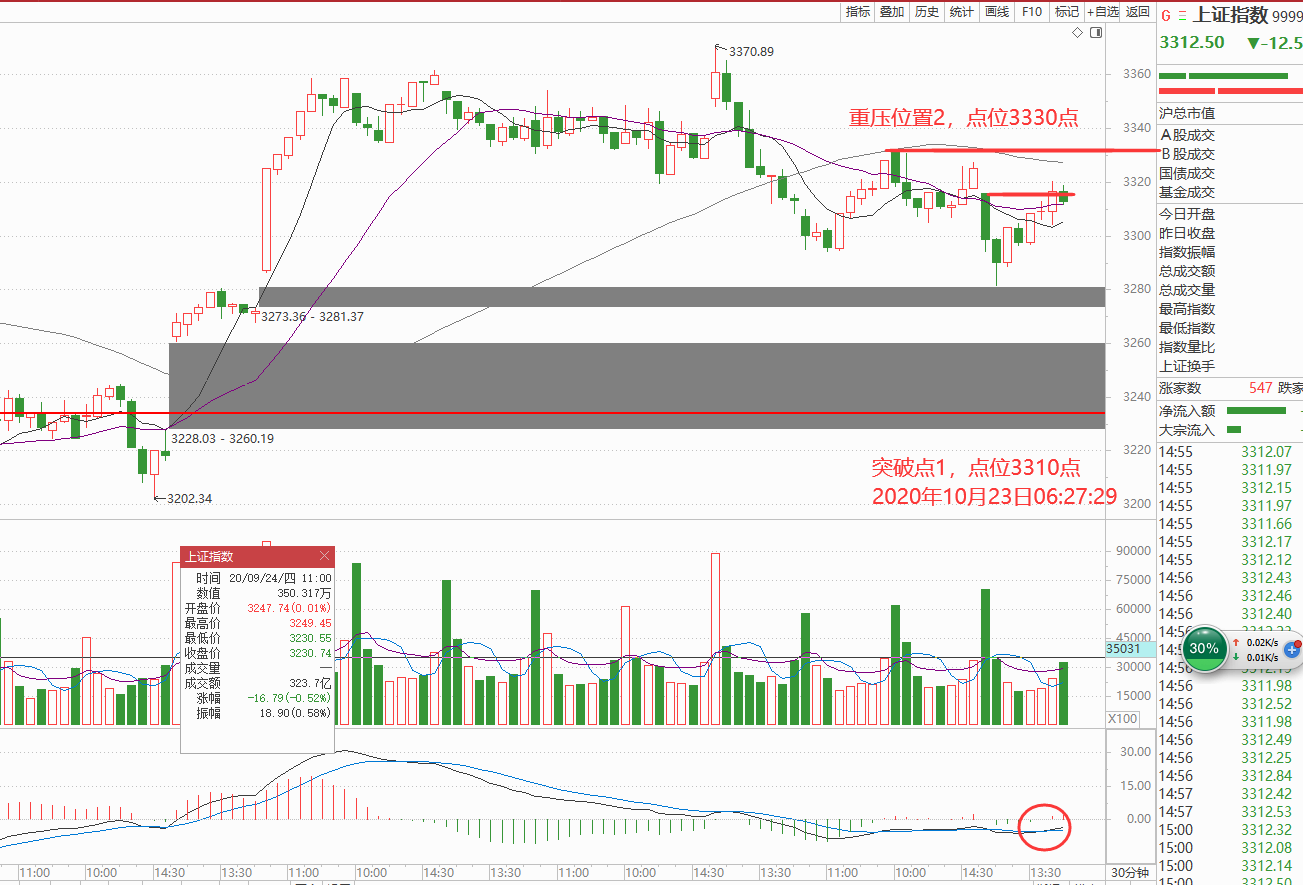 月线上还剩下5个交易日,周线今天最后一个交易日,那下周发动攻势的话难度大,没有持续的资金进场很难一口气爬上去,这样我们暂且信他站上多空分界线之后再做震荡,这就需要今天向上小幅突破,让周线稳稳的站在3330上方是最佳的攻略了,如图: