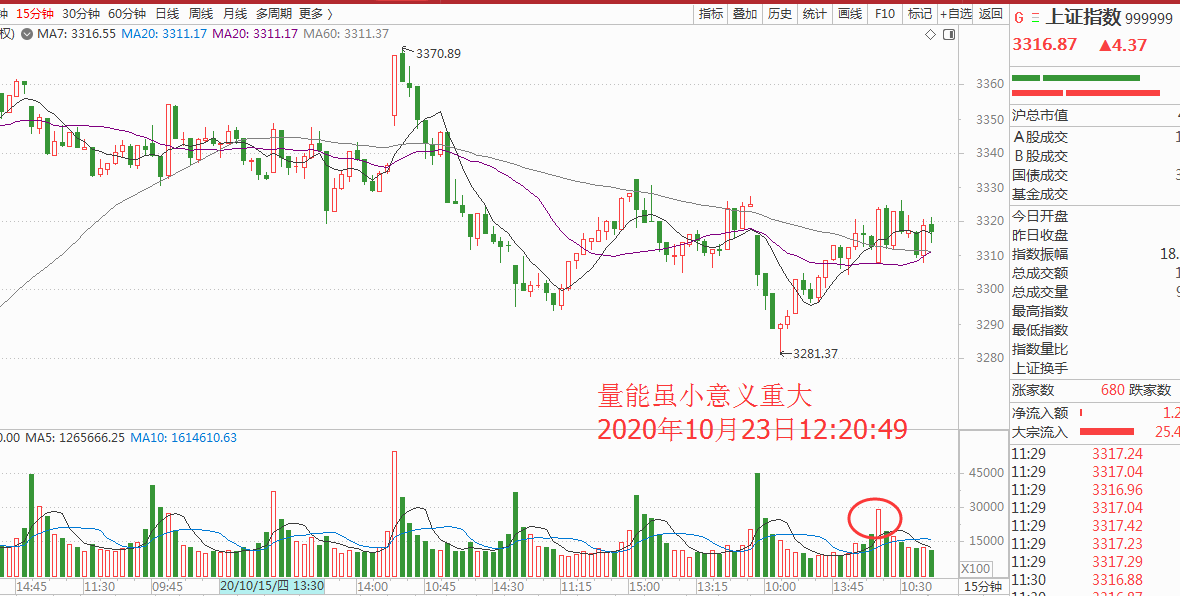 实际上早盘开盘15分钟信号是比较明显的,第一个5分钟和第二个5分钟是放量上攻的,我最喜欢这种,最怕的是跳空,因为跳空就会有获利盘卖出,这个现象不是一次两次了,所以今天早盘的走势很符合预期,在第一个15分钟成交额出来基本确定今天不会有上攻的大动作,因为15分钟成交额仅仅292亿,太少了,如图: