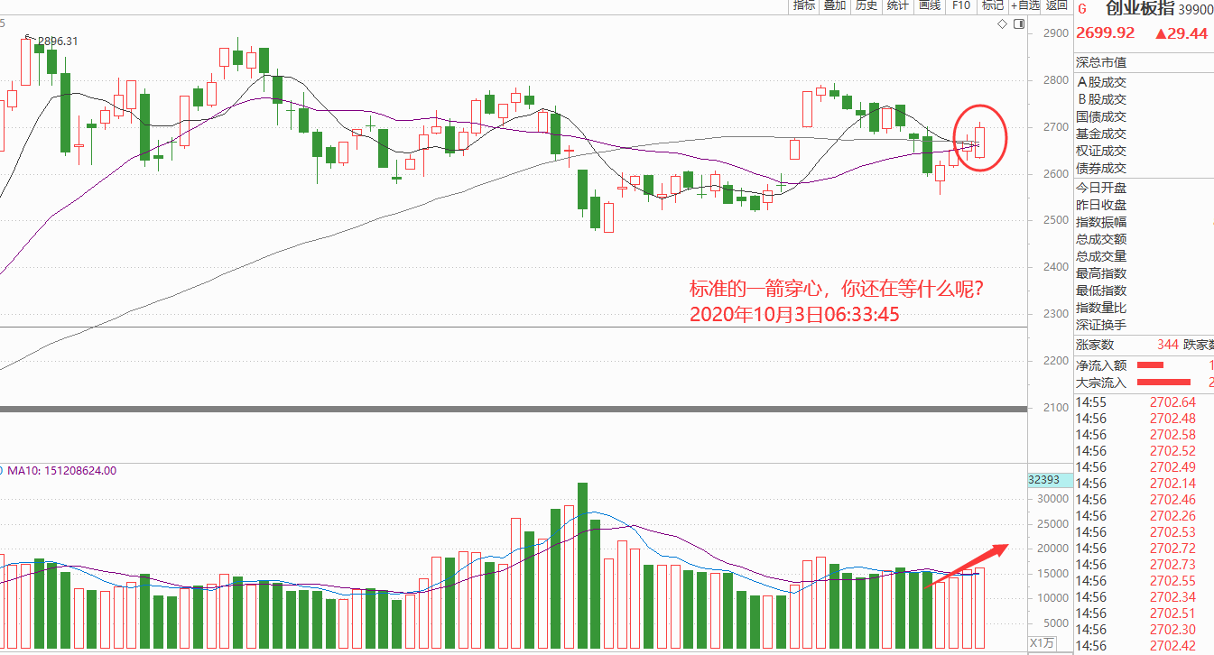技术上日线收出的K线稍微带上影线,特别是创业板走出了震荡盘整末端的一箭穿心形态,在这里郑重的告诉朋友们:没有出现破今天低点的情况走势,我是坚定的看多的,这是系统信号必须服从的,如图: