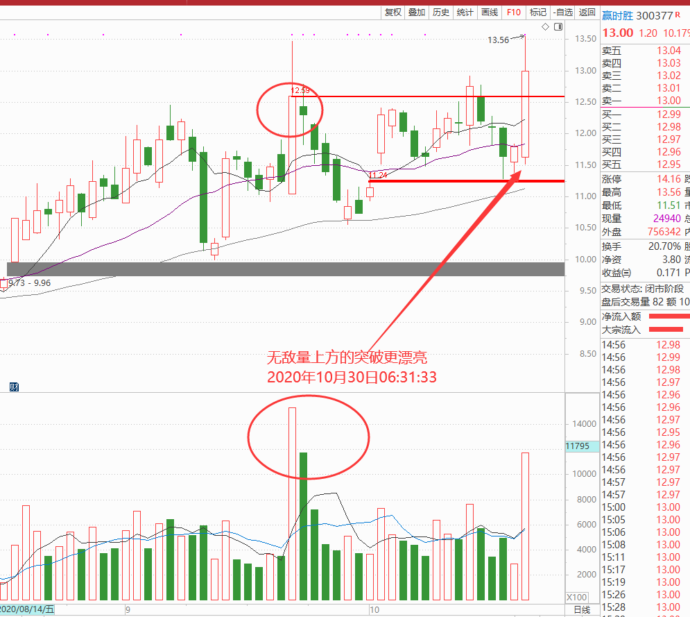 每一波行情的异动都离不开科技股的配合,昨天个股看了下图形,技术上比较喜欢赢时胜300377,已经突破无敌量,可以关注机会,除了无敌量还是进入了上升通道,如图: