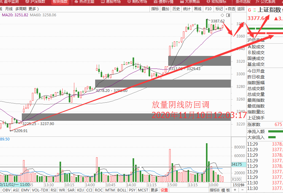 早盘小幅高开是预料之中,但是很快市场就有了小回调,在第一个15分钟收盘收出了895亿的巨量阴线,这很简单,牢记我们的趋势法则:上涨途中以前方重要的放量阳线做跟踪止盈,而且市场你要允许他涨涨跌跌,这样才能走的更健康,但是这样的结构是明摆着要有回调,我们找支撑点位就是了,早盘的放量今天想加速上涨比较难,左右个股机会会多多,如图: