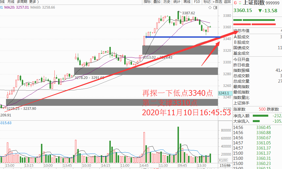 早盘小幅高开是预料之中,但是很快市场就有了小回调,在第一个15分钟收盘收出了895亿的巨量阴线,这很简单,牢记我们的趋势法则:上涨途中以前方重要的放量阳线做跟踪止盈,而且市场你要允许他涨涨跌跌,这样才能走的更健康,但是这样的结构是明摆着要有回调,我们找支撑点位就是了,早盘的放量今天想加速上涨比较难,左右个股机会会多多,而收盘时候的点位本来预期的是3340点附近,盘中最低下探到3346点,不过暂时看还不算结束,明天有机会再探一下低点,如图: