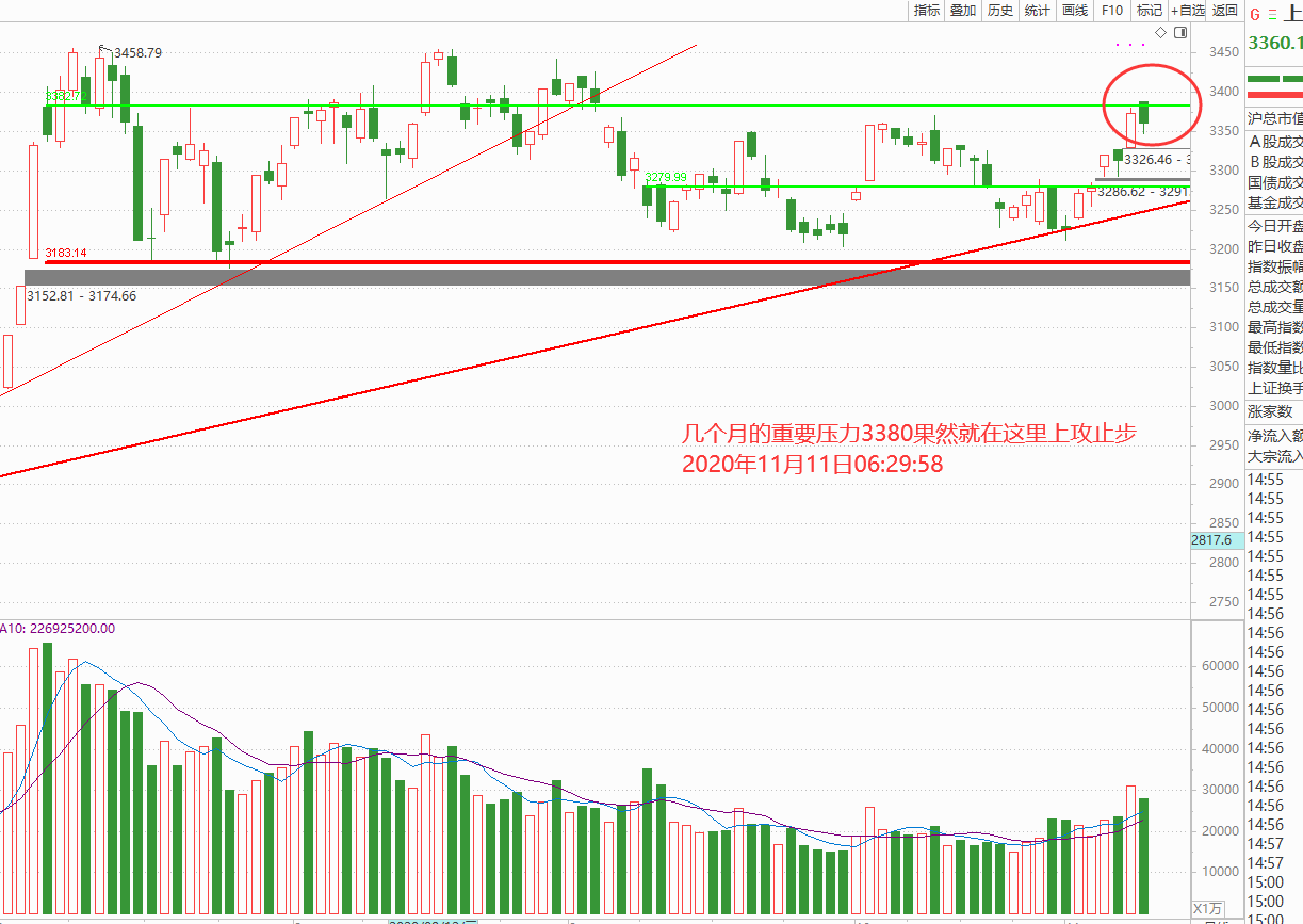 在这里首先吹两个牛,第一个牛是11月10日早盘的文章《板块切换今天医药闪亮眼(看这些公司)》提前给朋友们预防,让大家在高兴之余要注意3380点的重压,因为这里是7月份以来的压力位,说直白的就是一大波套牢盘解套,有解套盘抛售出场的可能。