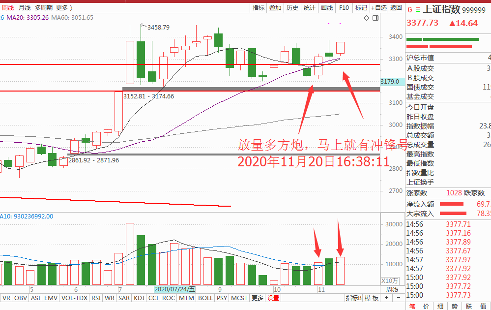 不管怎么样,大级别周期周线的结构就给我们多头的希望,放量上行结构已经送出,如图: