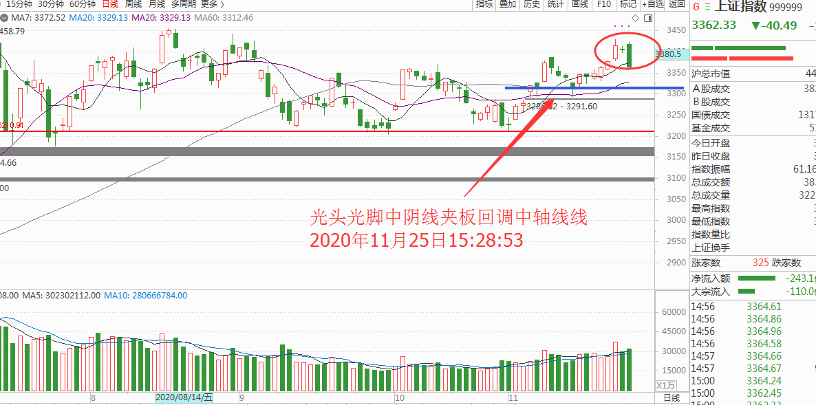 这消息是市场剧烈震荡的因素,反正市场需要回调或者上涨总是有消息配合,这个动作会引起他美爹的支持,这样的话就会有大国之间的摩擦升级的预期,市场不确定性引发剧震理所难免。我估计是大盘今天回调这么猛的主要诱因。而这样的实体阴线也预示着阶段回调的开始,如图: