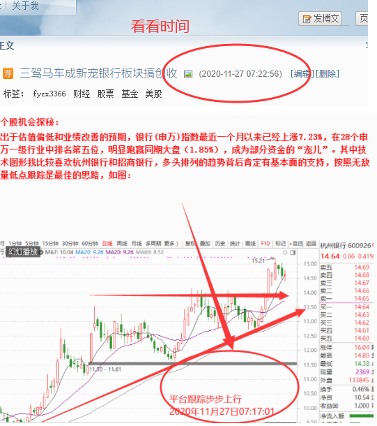 最终收盘行业板块的拉升是大金融,排列在前的就是银行、证券、保险三个板块了,而在周五早盘的时候我文章的标题就是“三驾马车成新宠银行板块搞创收”再次显现了对市场脉搏的精准透析,如图: