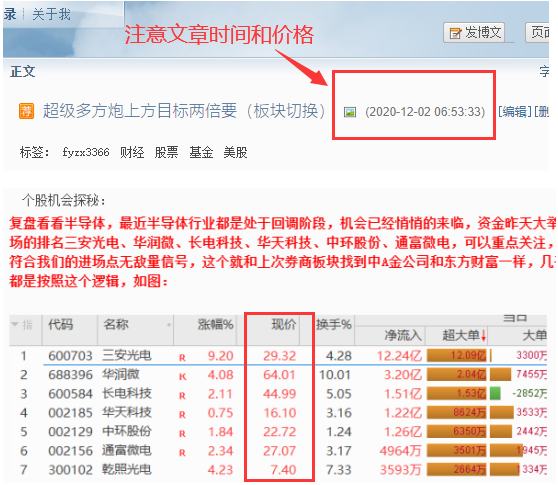 在看看周三早盘的文章标题:《超级多方炮上方目标两倍要(板块切换)》中明确说了资金进场排行前五的五家公司,如图: