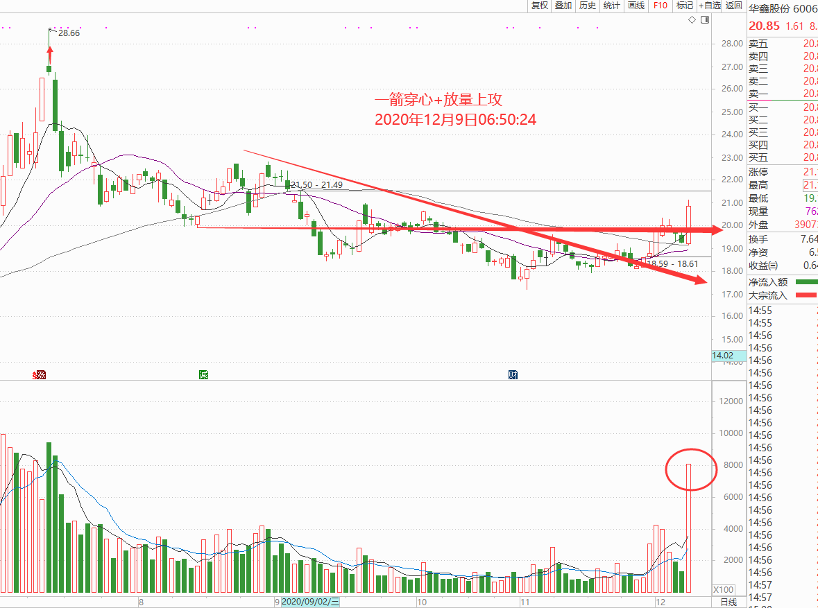 金融券商三驾马车任何时候都是启动时候的先行者,昨天大盘筑底形态结构也是这样的,排名在前面的华鑫股份业绩优秀,技术上盘整后一箭穿心上攻,已经走出了翻转结构,可以重点关注,如图