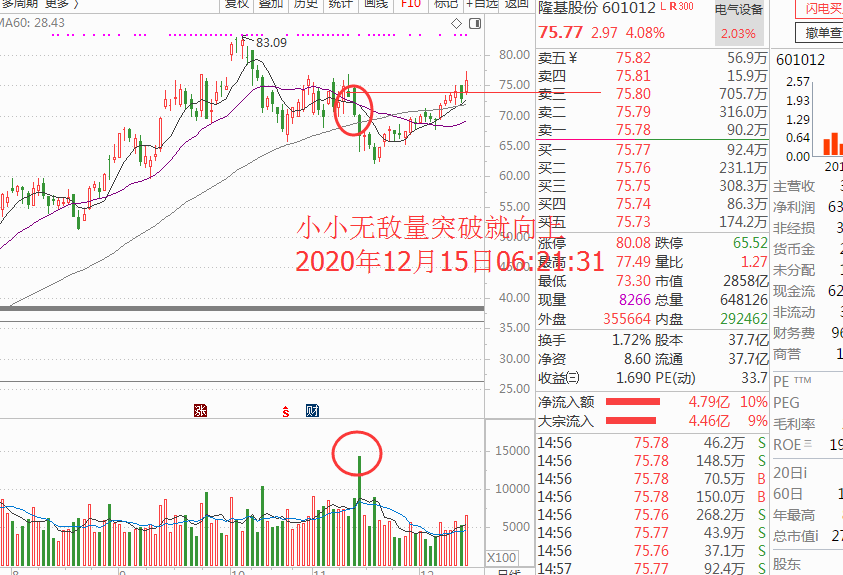 咱们既然看到了机电行业板块那就在这里找一找,依旧是按照资金推动的逻辑,排前的隆基股份、双一科技、国轩高科、阳光电源都是多头的技术结构,资金流入量能上逻辑首当其冲,并且有个小小的无敌量结构,可以重点关注,注意依旧是高位,所以轻仓避免追涨被套,进场设定保护低点就是周一的低点,如图: