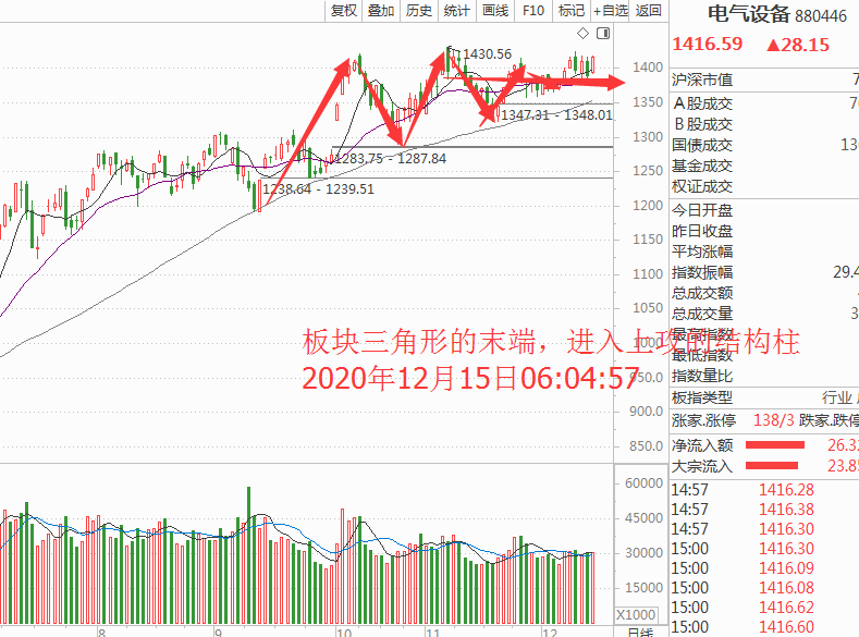 虽然其他行业板块没有动,但是很明显已经有42个行业板块收阳线,说明大家还是多多少少对这个底部的认可,哪怕是有抄底资金也是一种认可度,而且悄悄的电气设备、医疗保健、酿酒、半导体、有色、医药、有色都已经有了这样的小级别结构的形成。其中最强的当属电气设备和工业机械,和半导体,如图: