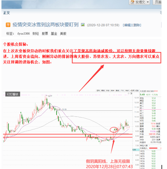 在上次农业板块异动的时候我们重点关注了荃银高科和通威股份,可以按照无敌量继续跟进,上周看资金流向,刚刚异动的排前的海大股份、苏垦农发、大北农、万向德农可以重点关注回调的进场机会。