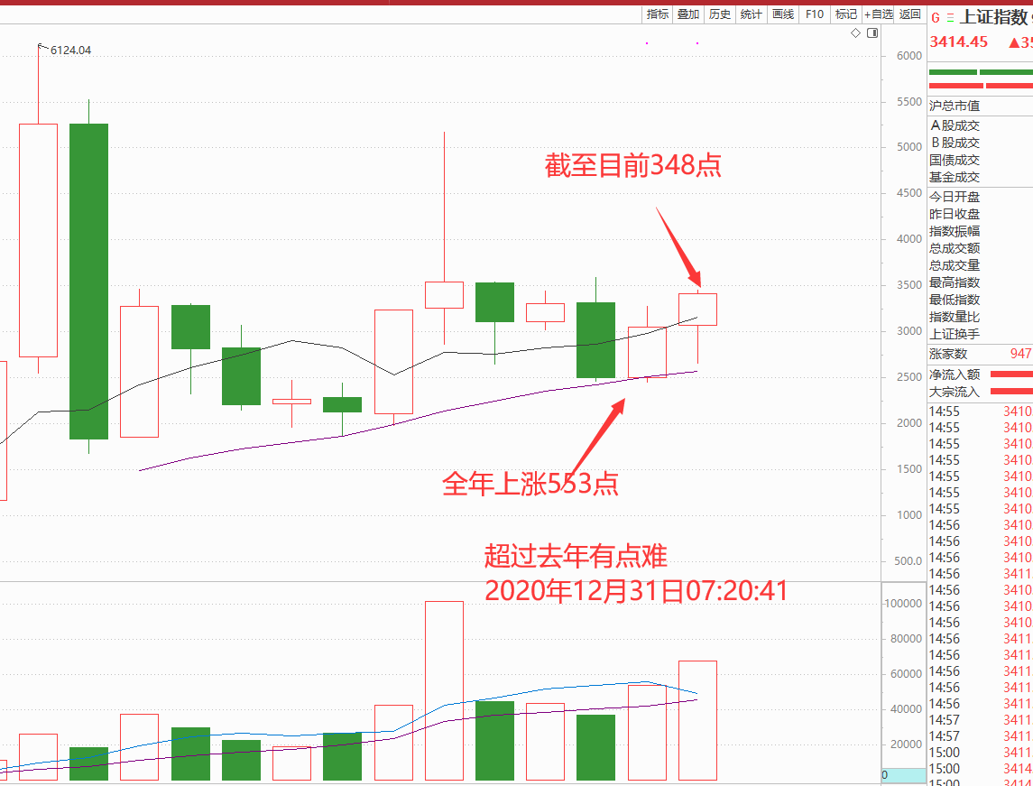 昨天收盘后最大的好消息就是和欧洲达成经济贸易往来的共识,这点意义重大,具有里程碑的标志,也是摆脱西方国际束缚的新开始新纪元,技术形态今天是年线最后一天,距离前高3323点也仅仅剩余十几个点的涨幅,而去年全年的涨幅是553点,今年截至目前涨了348点,看来今年想超过去年是没有希望了,所以这个层面上今天最后一天不需要上攻太多,只需要稳住上行就可以了,如图: