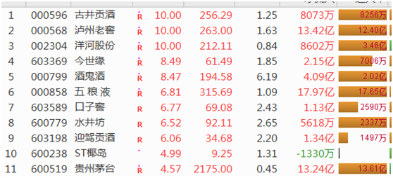 除掉ST的椰岛,贵州茅台的涨幅排名在第十位,净流入的排名按照资金大小排名第一的是五粮液、泸州老窖、贵州茅台、酒鬼酒、今世缘、老白干、迎驾酒、口子窖、洋河股份、古井贡酒;这样排名一列明眼人就看得出来了,谁好谁差真金白银说了算。