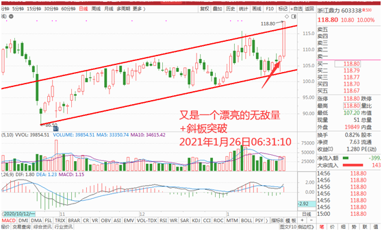 工业机械板块也是多头排列,昨天这个板块行业的浙江鼎力突破连续几个月的震荡区间,业绩上也是连续三年持续增长的势头,2018年同比增长69.68,2019年同比增长44.45,2020年预期增长也是同位数,可以继续寻找回调的机会,当然,保护点无敌量是必须的,如图: