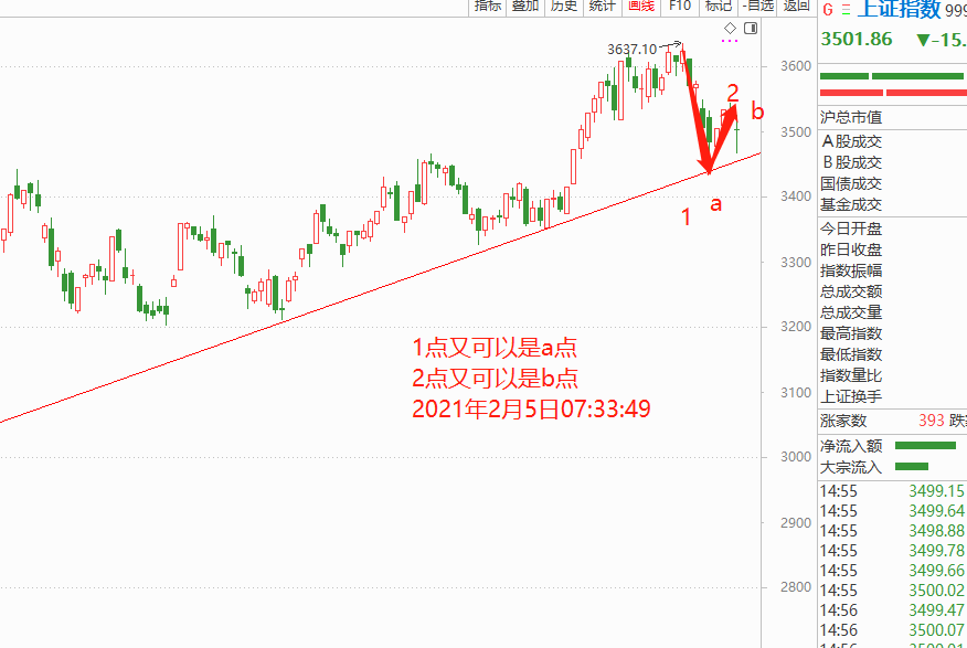 昨天走势售出了阴线的十字星,表明市场犹豫不决,对是上还是下双方都没有动力了,在周三冲高的时候我文章说了,谨防这里走出下跌的b点,通常说的2b,既可能是回调的b点,也可能是加速下跌回调的2浪点,所以就是2b点了。如图: