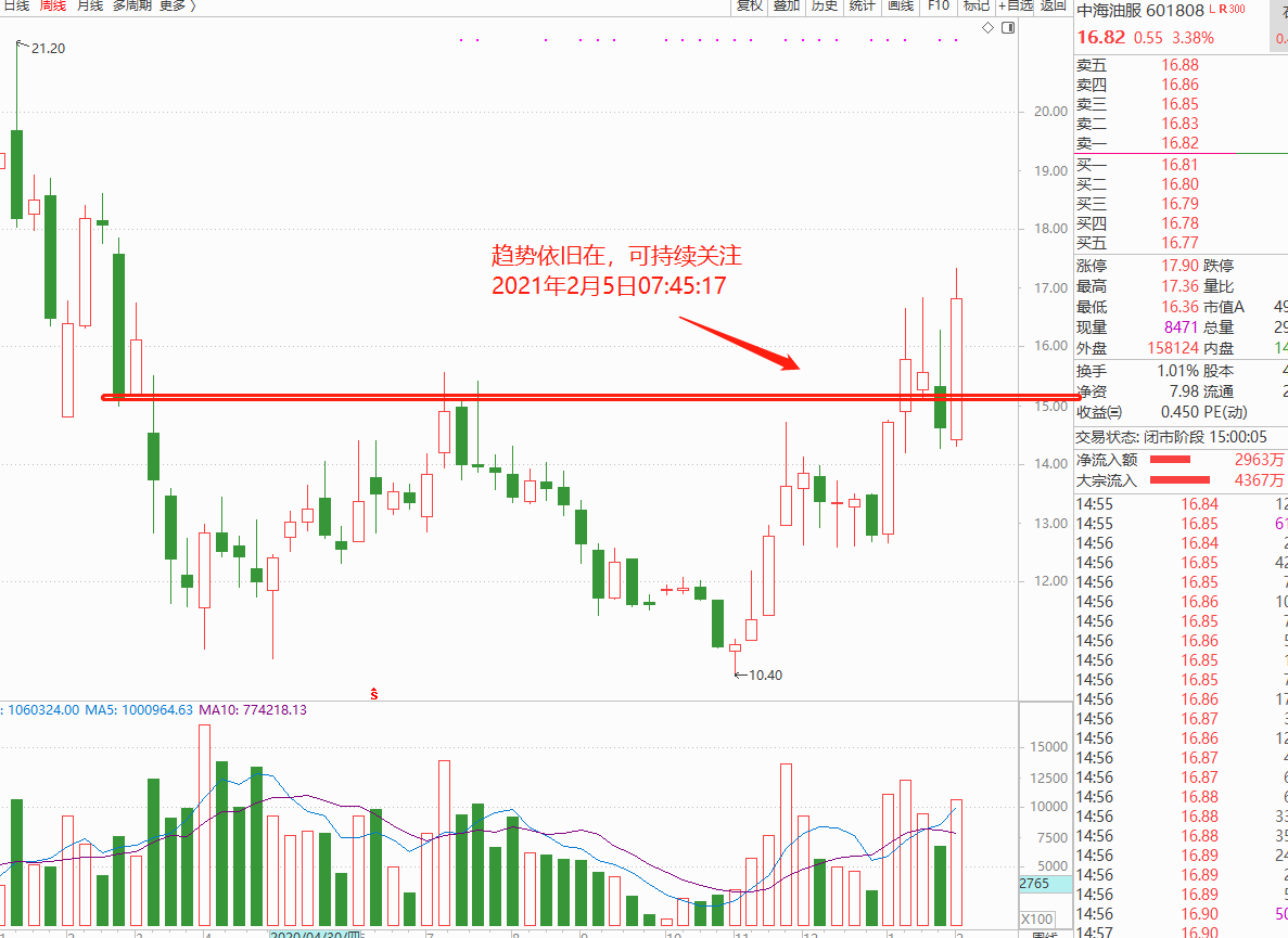资金排名前几的主要有海油工程、中海油服,趋势上中海油服更胜一筹强者恒强,可关注回调的机会,和无敌量跟踪,如图: