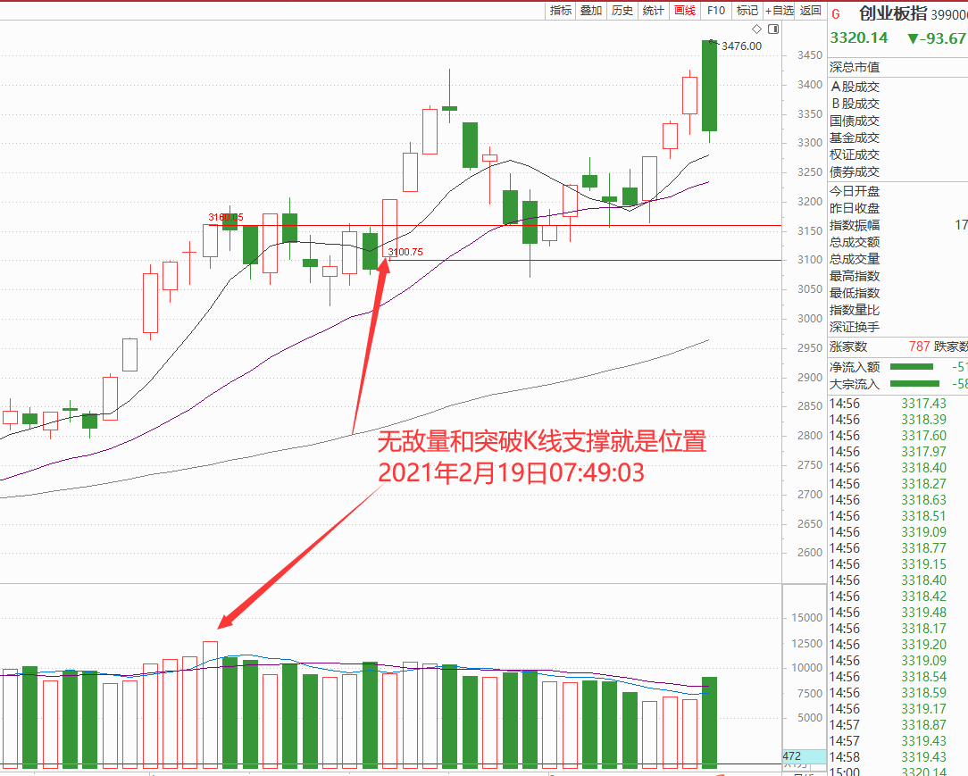 技术上主板是跳空假阴线,而创业板和科创板就难看了,特别是创业板稀里哗啦跌幅3%,这技术形态简直可以称得上是断头铡刀,这结构图形再回调200点到3100—3160也是正常,所以短线要规避创业板回调的风险,如图: