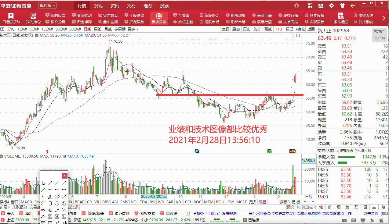上周我提醒了医药行业和地产行业的异动,地产行业紧接着就是有消息打压,这地产行业不会走太长,不过公司已经到了股指价值低洼地,反弹些许也在所难免。而周五资金关注的当属万科A、特发服务,曾经的新城控股不小心也进入了人们的视线,没办法,钱能改变一切,业绩优秀加上技术形态我比较喜欢新政的002968的图形,可以重点关注他回调的机会,重点业绩也不错。如图: