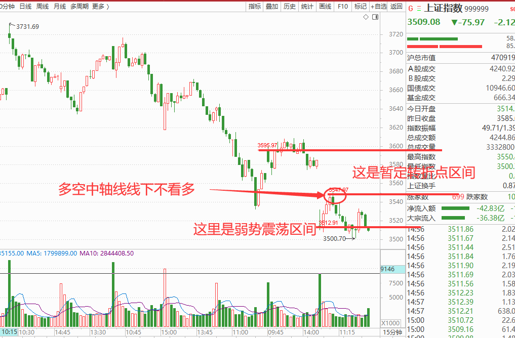 大盘走势收出阴线的上影线十字星,位置到了趋势线3500点附近,时间到了,点位到了,现在需要的是转折点信号-----小级别向上的突破,在没有突破之前,依旧是安装15、30分钟无敌量座空的思维跟踪,如图: