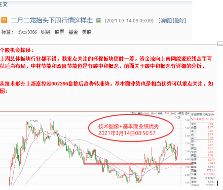 当然你也可以任务是主力资金洗盘时间不够,我觉得这个理由反而比较充分可信,在3月14日早盘确认了环保板块要加速,适逢二月二龙抬头,文章《二月二龙抬头下周行情这样走》重点提醒关注了技术图像和业绩都优秀的002266浙富控股,今天再次发力盘中上涨了8%个点,如图:
