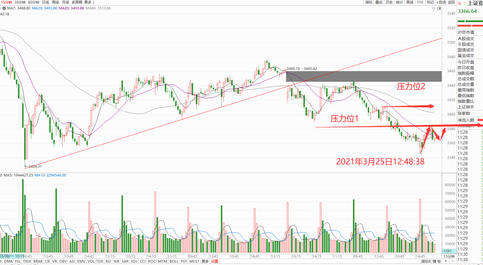 今天早盘收线和昨天有点相似,昨天15分钟收线之后根本没有反击之力直接全天震荡下跌,今天早盘依旧是收真阴假阳线,成交额也放大,下行的跳空缺口也比昨天要小,这是下跌衰竭的表现。