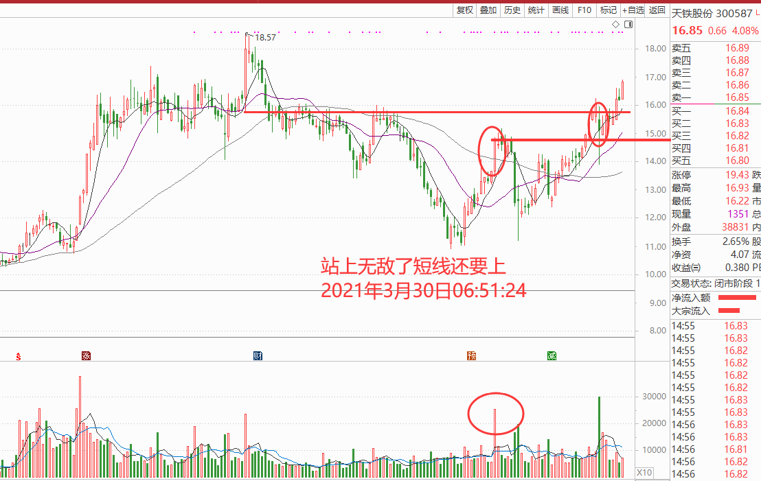 天铁股份公告同比增长6602.15%-7292.08%。在我国加快交通强国建设,大力发展都市圈、城市群并强调低碳绿色出行的背景下,轨交行业景气度较高,尤其是城际和市域轨道建设增长较快,公司受益于该类新基建的快速发展,技术形态也符合我的无敌量,可以关注回调的机会,如图: