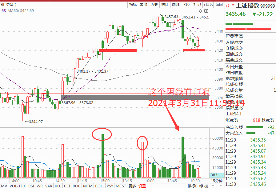 昨天说了注意技术派压力位的回调,早盘回调后目前看这个位置的有止跌迹象了,也就是早上说的第一支撑点位3423点附近,最低达到3420点,也是均线支撑的位置。