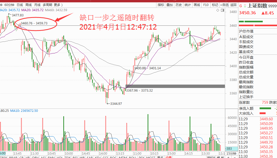 果然在第二个事务分钟已经拿下了早盘的高点并且继续上攻刺探缺口的压力,缺口虽然没有拿下但是也是仅仅剩下不到1个点的距离,可以说是胜利在望了,如图: