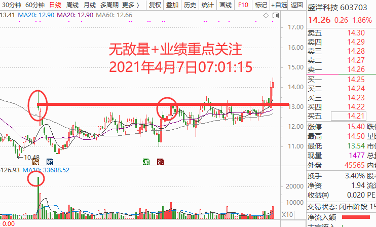 技术上大家都是一条线,很明显业绩上提前启动的相对优秀很多,盛洋科技、华测导航就比前面的第一次底部行动业绩优秀,所以现在提前站上无敌量,进入多头趋势,可重点关注,如图: