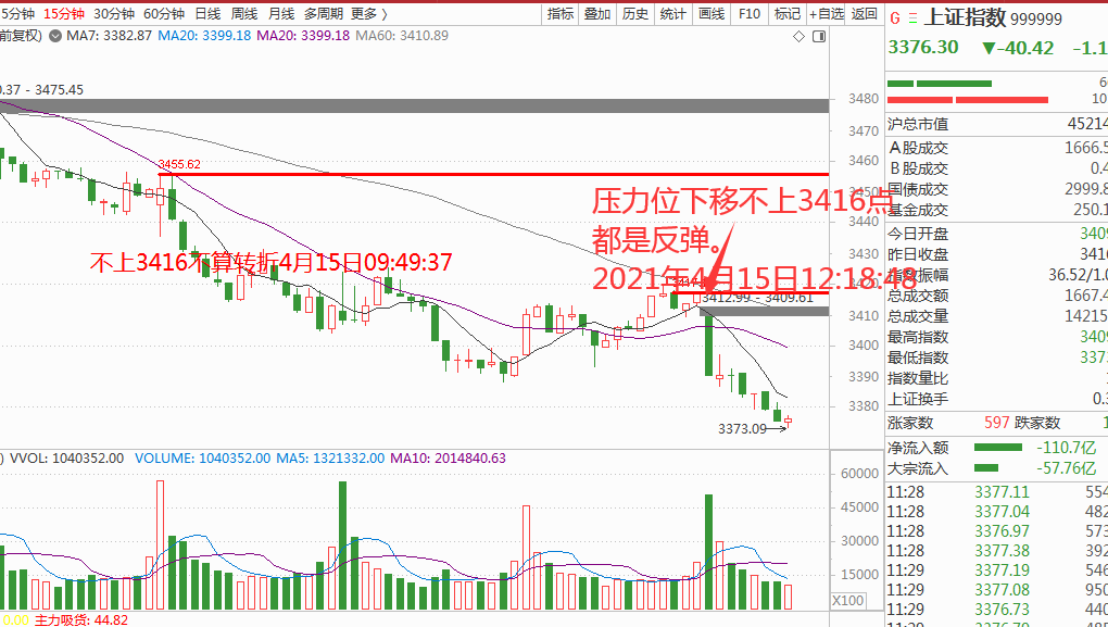 今天早盘开盘的15分钟成交额505亿收阴线再次确定了我的观点,那就是所有没有上3423点的上攻都当做反弹,不算翻转,这是昨天早盘就定的基调,目前看,继续下移到了新的压力位,不上3416点的高点都是反弹,如图:、