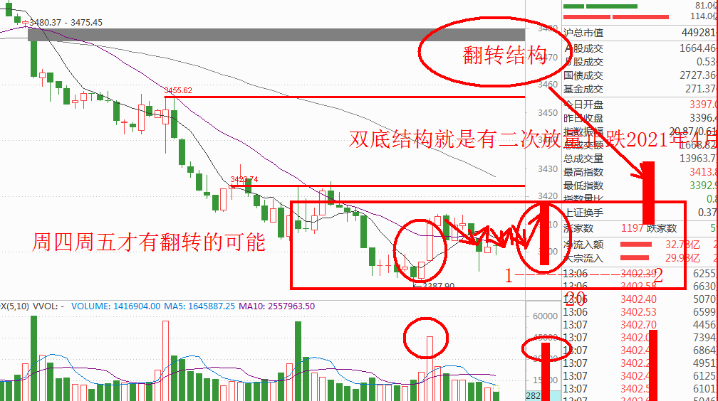 今天早盘开盘的15分钟成交额505亿收阴线再次确定了我的观点,那就是所有没有上3423点的上攻都当做反弹,不算翻转,这是昨天早盘就定的基调,目前看,继续下移到了新的压力位,不上3416点的高点都是反弹,如图: