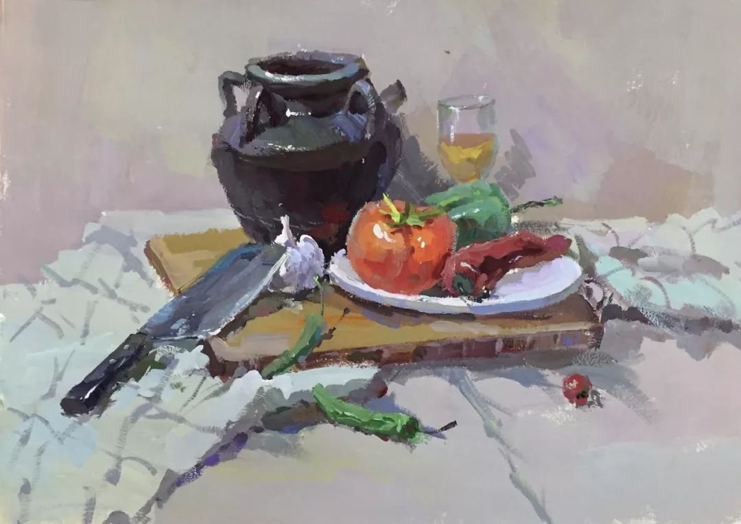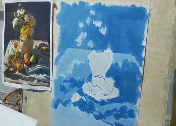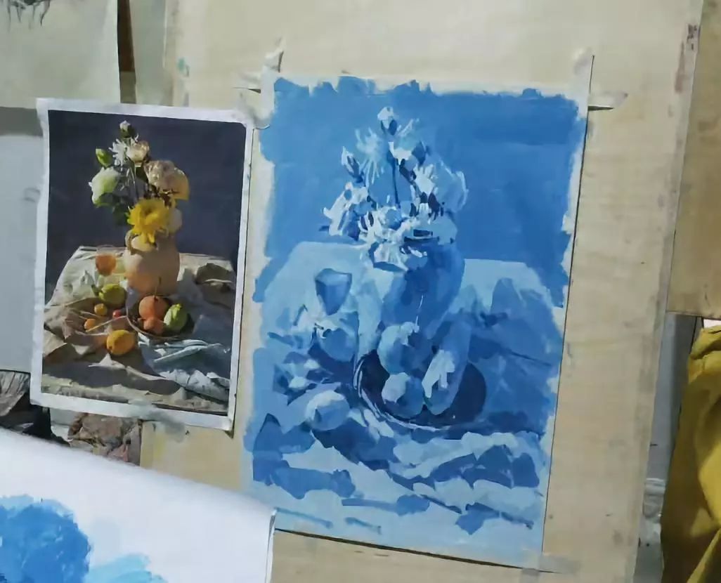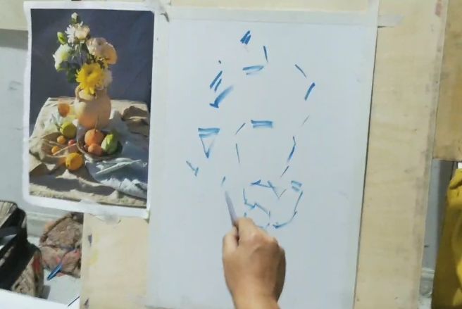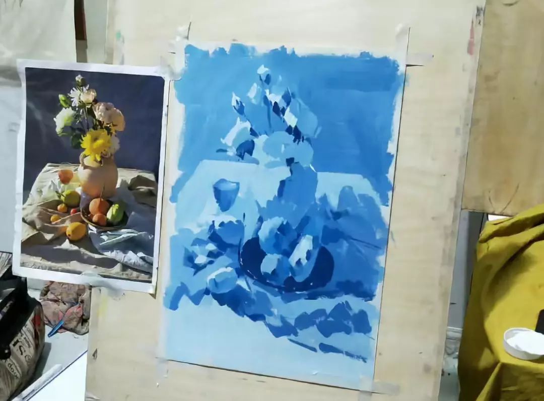 整体地铺出背景、衬布和每个物体的颜色。第一遍铺色时尽可能拉开画面的黑白灰、主次关系的对比。还要将物体的位置画准确,还有物体大致形体、投影。褶皱的时候要把画面大的关系画出来,以构成完整的画面。