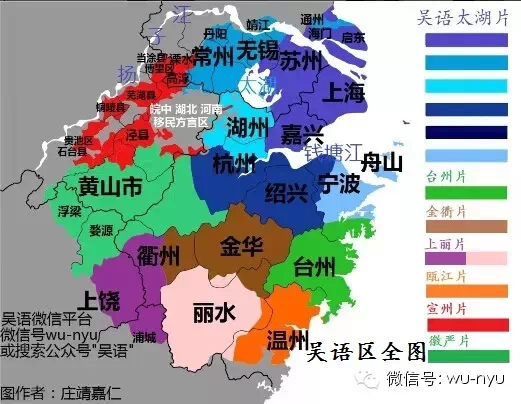 吴语是一门古老的语言,通行于上海、浙江、江苏南部、皖东南 赣东北边界。其中上海、浙江北部大部分、江苏南部大部分,同属吴语最大的一个分片:吴语太湖片。(图上所有泛蓝色地区)。包括了苏州话、上海话、宁波话、常州话、绍兴话、无锡话等一系列子方言。