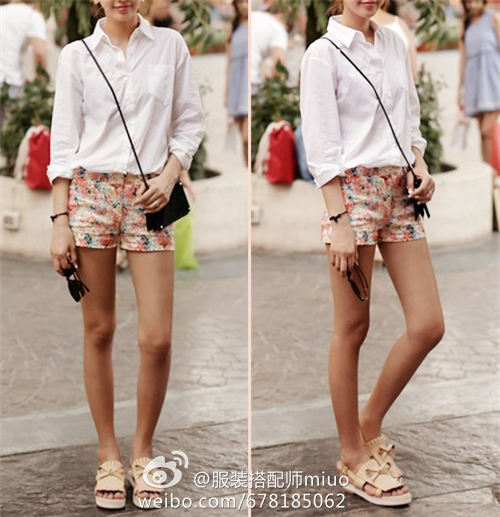 搭配短衬衫,衬衫的领口解开,露出锁骨;香奈儿风格的小包与匡威帆布鞋混搭;头上的爵士小礼帽,增添时尚感;而且整套搭配中,帽子、热裤、鞋子的颜色相呼应。