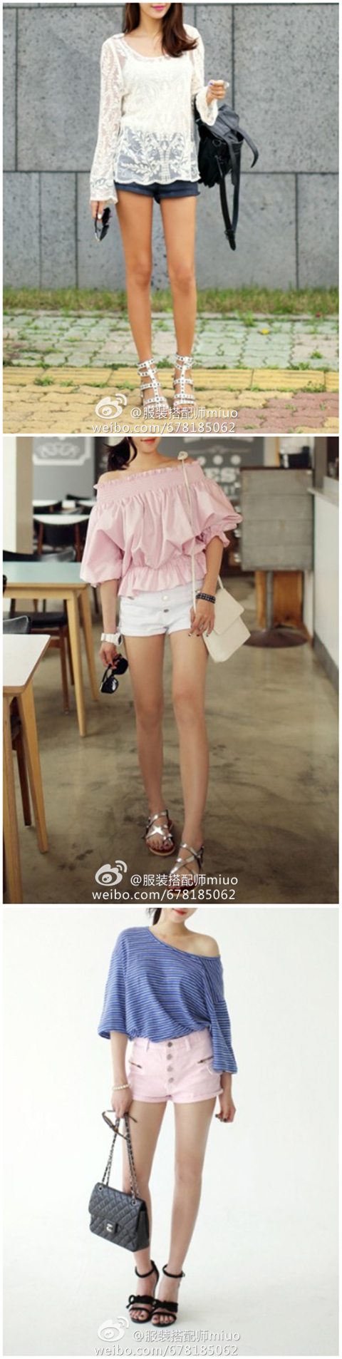 另外,其实短热裤的穿搭,除了把上衣下摆塞进裤子腰头,也可以遵循“上宽下紧”的穿衣法则,就是上半身搭配略宽松的衣服,下半身就穿短热裤。不过唯一的要求是,宽松上衣的领口必须要大、至少露出锁骨,不然会很容易显胖。但如果上衣领口够大,不仅不显胖,还会显瘦显高。