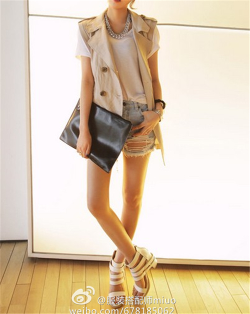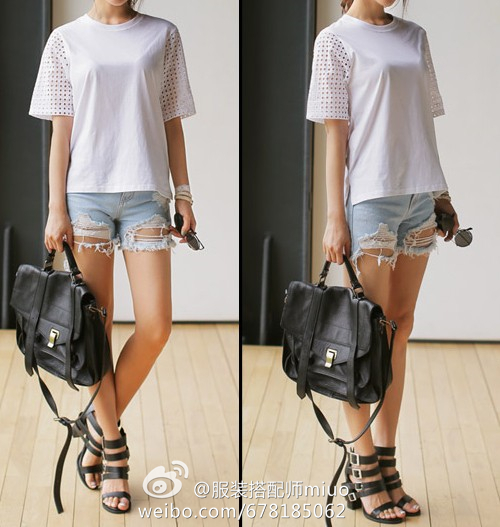 即使是同一件T恤+裤子,因为穿着的方式不一样,带来的效果也会很不同。就比如下面这身:牛仔热裤直接套上一件略宽松的小领口T恤,若不是因为模特身材好、腿长人又瘦,那么就会很悲剧,纵使鞋子、包包、其他局部细节配的再好,也会暴露出很多上半身的缺点,尤其是胸大、肩宽的人。(还记得我前几天说过“显高显瘦才是服装搭配的第一步”吗?)