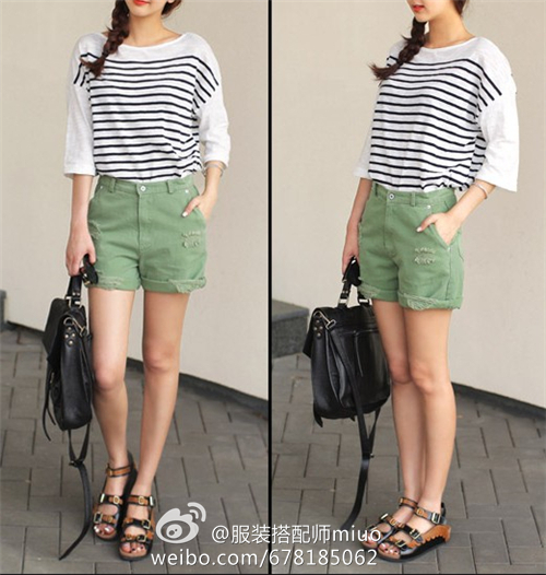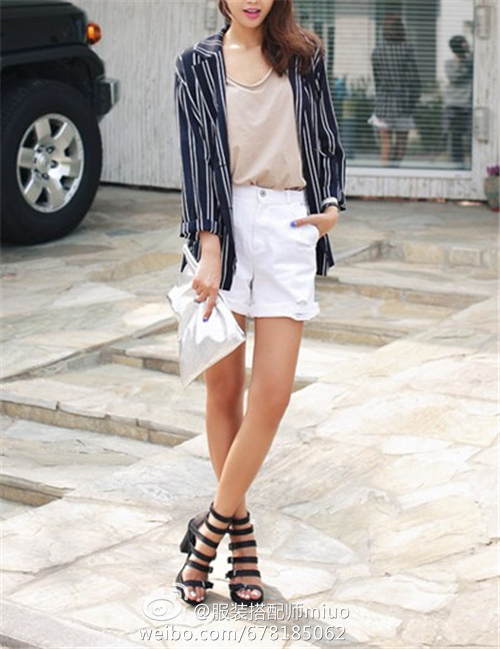 竖条纹的热裤,搭配淡蓝色的上衣。