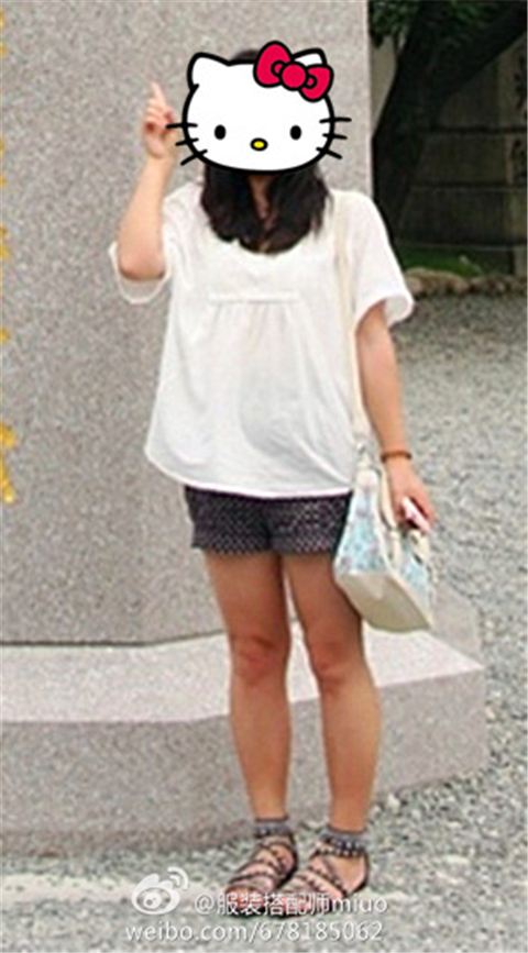 最后附上一张普通的女生的穿着短热裤+宽松上衣的照片。这个妹子身高155,体重估计超110,你看的出她那么矮、还那么胖吗?最多觉得有点肉吧?谈不上“胖”吧?所以夏天对于胖人来说,宽松的上衣(一定要大领口)+短热裤(别太包腿),是很显瘦的组合!