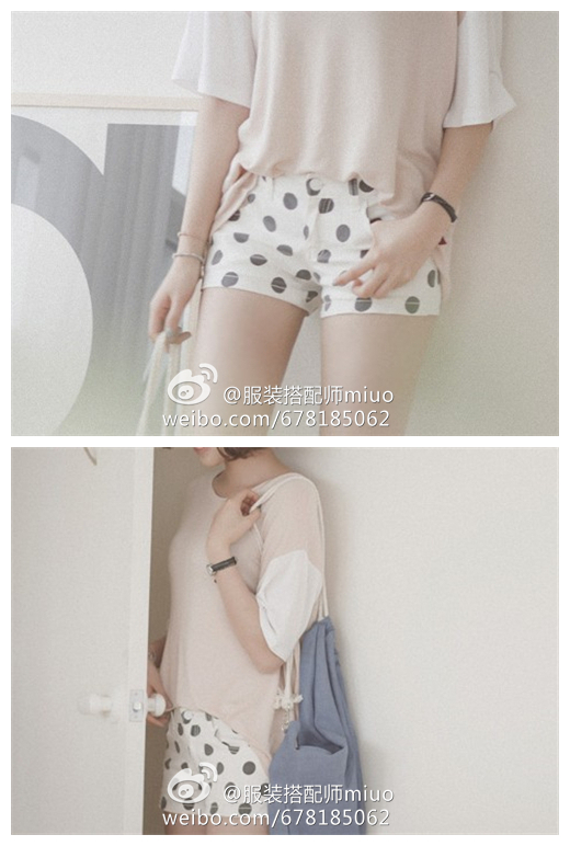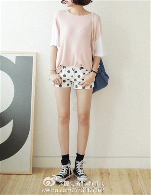 另外,对于颜色比较不百搭的热裤,除了搭配纯色,你还可以选择条纹、波点等元素。
