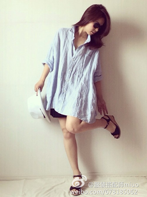 同款宽松大衬衫,相比起上面那套搭配,若是体型较胖的矮个子女生,建议像下面这套学习,让腿部显得利落、修长,才是重点。