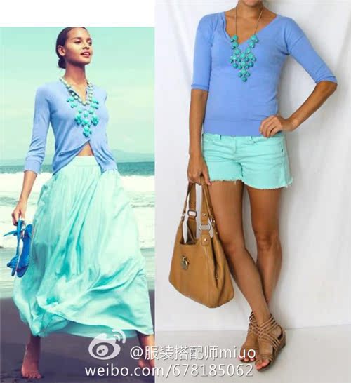 没关系,薄荷绿的热裤也可以达到类似的视觉效果。天蓝+薄荷绿的配色,非常清新宜人。