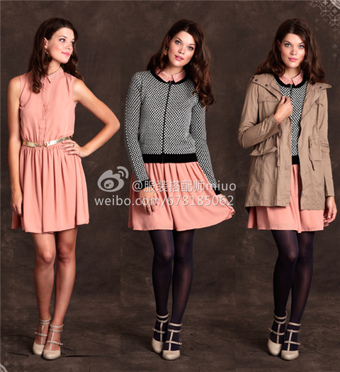 比如下图中,一件粉色无袖连衣裙,夏季时单穿、秋季时配上针织开衫、连裤袜,就可以继续穿,到了冬季,在针织衫外面再加上一件厚大衣、换双厚点的裤袜、或者还可以把单鞋换成长靴、过膝靴,依然是一套很棒的搭配,而且看起来还很有层次感。