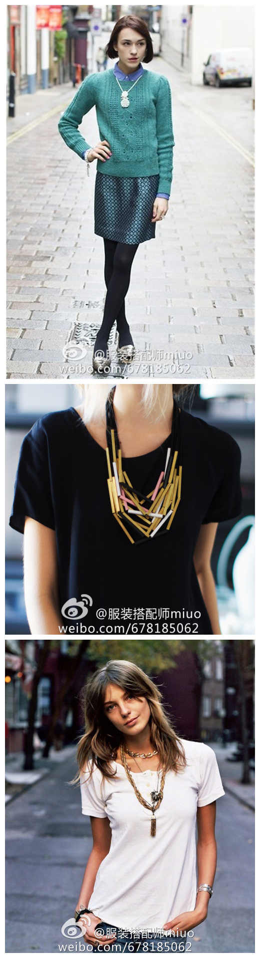 同样的道理,宽肩姑娘,当你的衣领过高过压抑时,佩戴一条别致夺目的长项链,也能起到收拢视觉重心的作用!从而弱化肩部轮廓。
